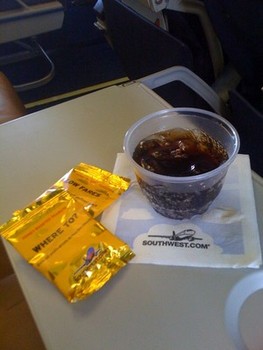 Now for the activity to distract from the cramp that is developing in my calve – the food service. The flight attendant tosses it to me like feeding time at the zoo. I go for the Coca-Cola and Doritos chips filled with highly pressured air and a couple of actual chips. As I open it up, the passenger in front of me gives me a look as if I had a flatulence problem. I am so embarrassed. It was the chips! Anyhow, I am sure this will fill me up for the next 10 minutes.